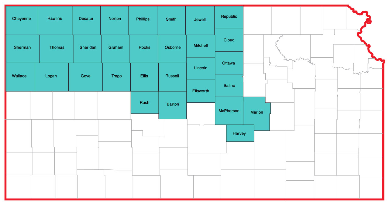 • Barton, Cheyenne, Cloud, Decatur, Ellis, Ellsworth, Gove, Graham, Harvey, Jewell, Lincoln, Logan, Marion, McPherson, Mitchell, Norton, Osborne, Ottawa, Phillips, Rawlins, Republic, Rooks, Rush, Russell, Saline, Sheridan, Sherman, Smith, Thomas, Trego, and Wallace.