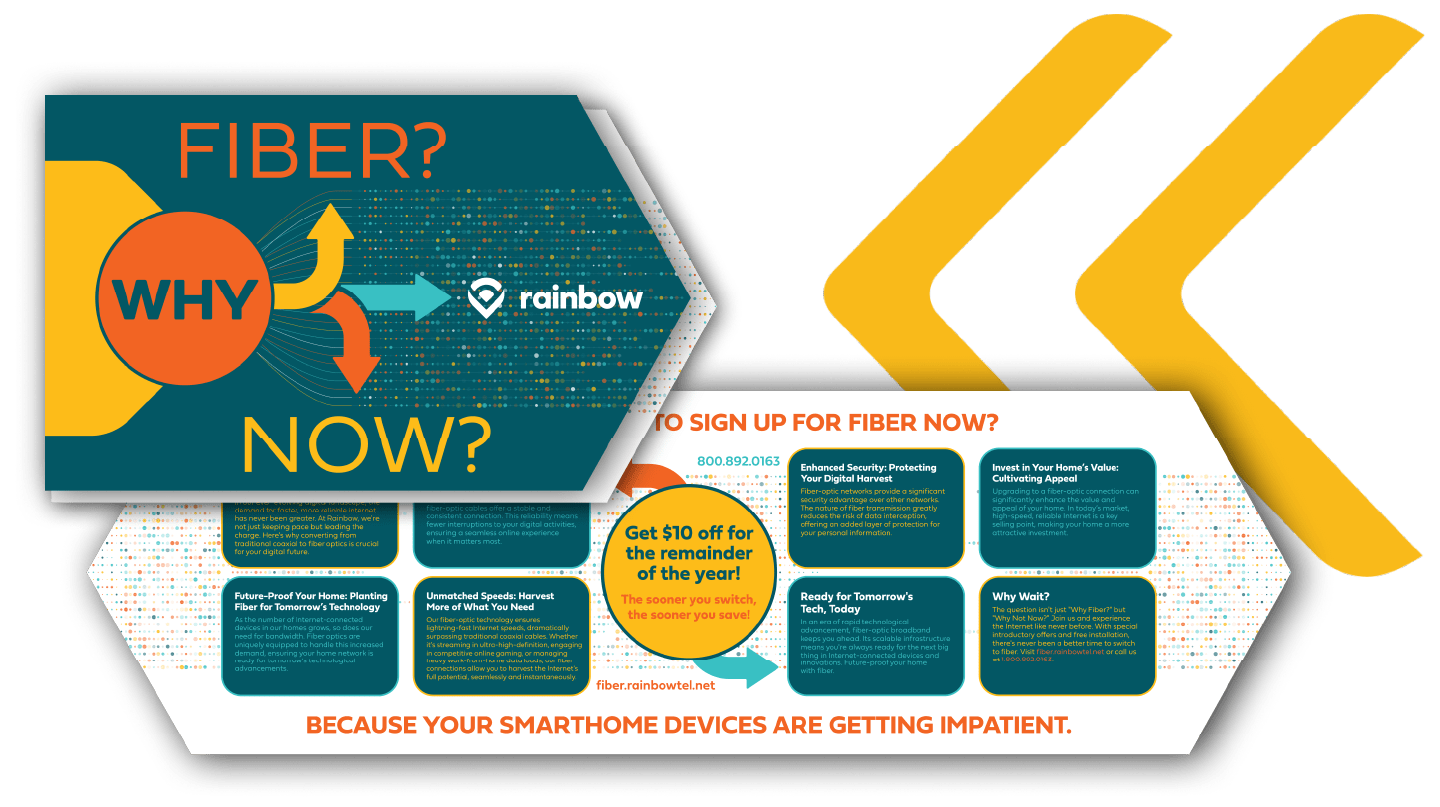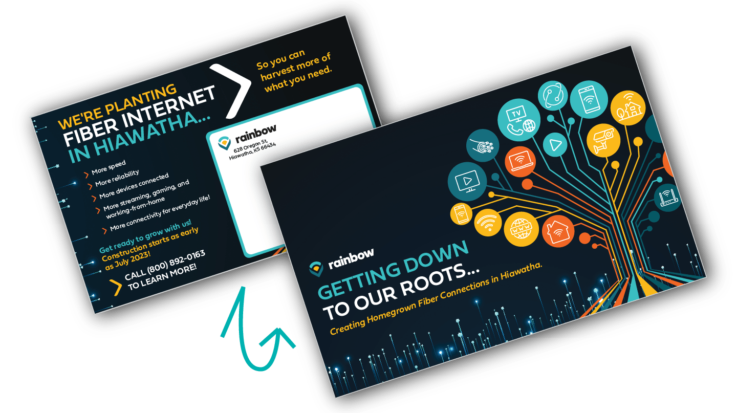 Our design and strategy team took the Homegrown Fiber idea and created copy and imagery to showcase how fiber could grow into a tree – symbolizing the growth of Rainbow throughout the years within the communities, and now growing into a fiber network. The campaign can be seen in all aspects of Rainbow’s marketing, from their fiber website, to direct mail campaigns, door hangers, neighborhood signs and digital ads.